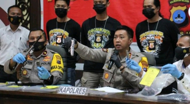 “Saat itu tersangka menyandera korban (M) dengan senjata jenis pistol yang dipegang di tangan kanan, sedangkan 1 buah senjata rakitan laras panjang di sandang di depan dada dengan menggunakan tali sandang,” beber Kapolres HSU.