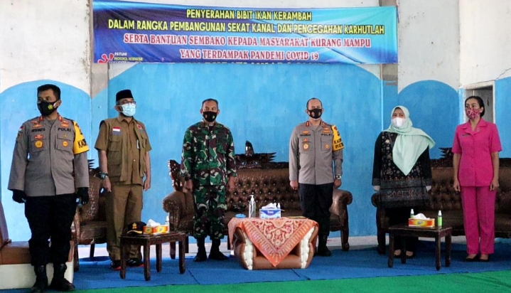 Penyerahan Bibit Ikan Kerambah dalam rangka pembangunan skat kanal dan pencegahan Karhutlah serta Bantuan Sembako kepada masyarakat kurang mampu yang terdampak pandemi covid19 di wilayah Kec. Kumpeh Ilir Kab. Muaro Jambi oleh Kapolda Jambi Irjen Pol A. Rachmad Wibowo, S.I.K pada Senin 10/05 pukul 10.00 wib.