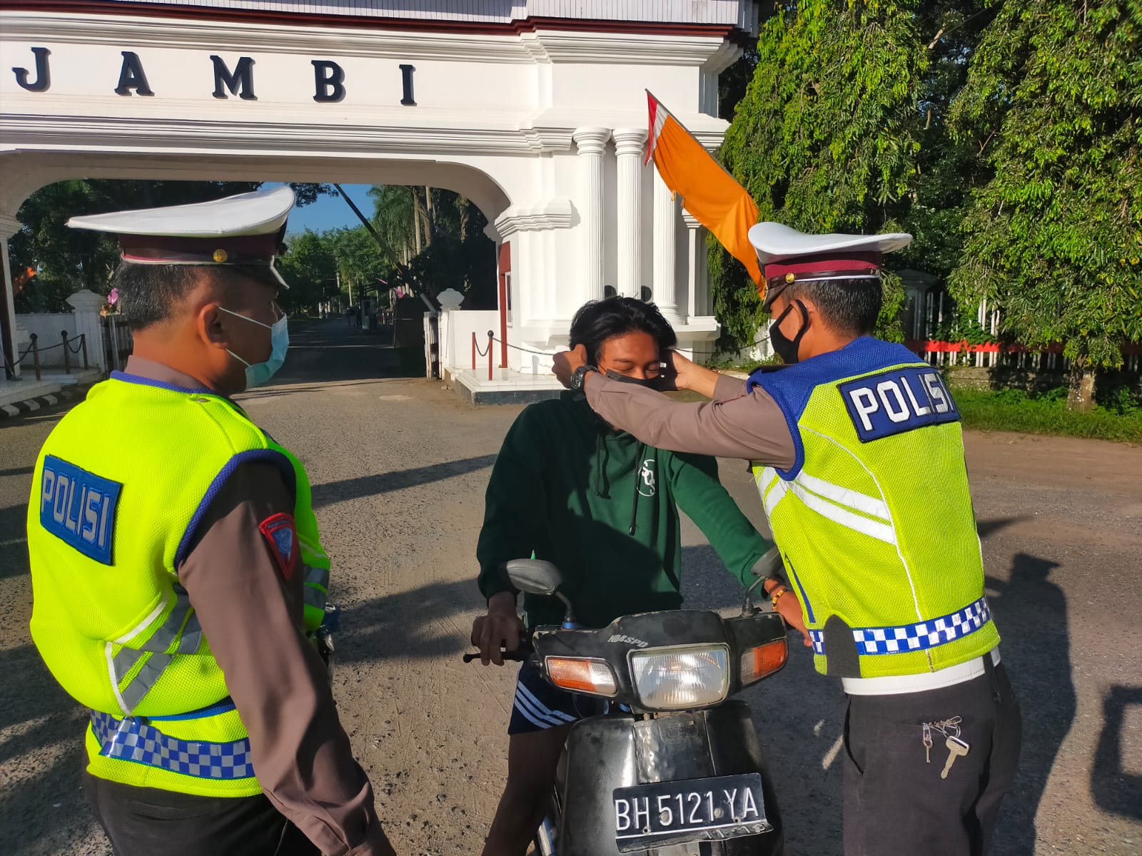Personel Satlantas Polres muaro jambi Gencar Bagi Masker ke Pengguna Jalan di Masa PPKM Mikro