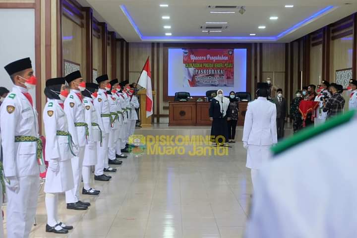 HALOINDONESIANEWS, MUARO JAMBI-Upacara Pengukuhan Pasukan Pengibar Bendera Pusaka (PASKIBRAKA) Kabupaten Muaro Jambi Tahun 2021 oleh Bupati Muaro Jambi Hj. Masnah Albusyro, SE, M.Tr.IP. didampingi oleh Pabung (Perwira Penghubung) Kabupaten Muaro Jambi Kodim 0415/Jambi Mayor Inf. Suafendi, S.Ag dan Kadis Pariwisata, Kepamudaan, dan Olahraga Riduan.