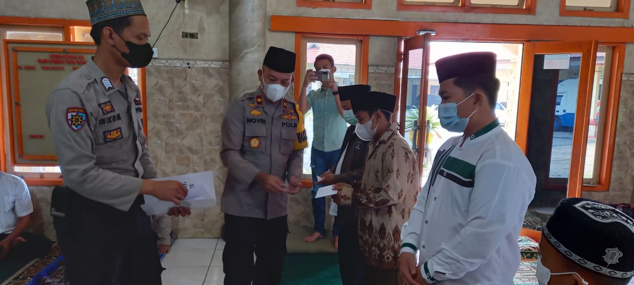 Kasubag Humas Polres Muaro Jambi AKP. Amradi.SE dan Acara kegiatan dilanjutkan dengan doa bersama dan pemberian santunan Secara langsung oleh Kompol Novrizal kepada anak yatim piatu.