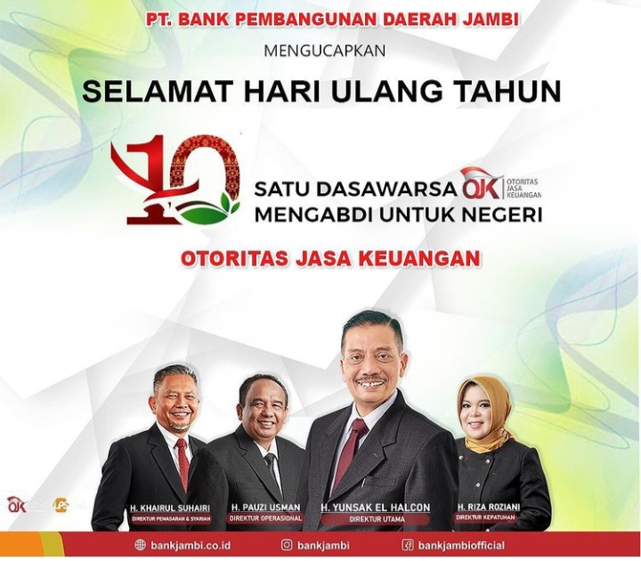 HALOINDONESIANEWS, JAMBI – Pimpinan beserta segenap jajaran Bank 9 Jambi melalui Direktur Utama Bank 9 Jambi Yunsak El Hacon menyampaikan ucapan selamat Hari Ulang Tahun (HUT) Otoritas Jasa Keuangan (OJK) yang ke-10, Senin (22/11/2021).
