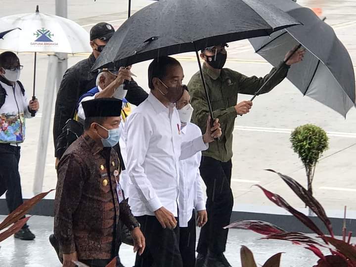 Cuaca hujan menyambut Presiden Joko Widodo dan Ibu Iriana Joko Widodo saat tiba di Bandar Udara Sultan Thaha Saifuddin, Kota Jambi sekitar pukul 08.00 WIB. Di tangga pesawat, Presiden dan Ibu Iriana disambut Gubernur Jambi Al Haris, Pangdam II/Sriwijaya Mayjen TNI Agus Suhardi, Kapolda Jambi, Irjen Pol A. Rachmad Wibowo.