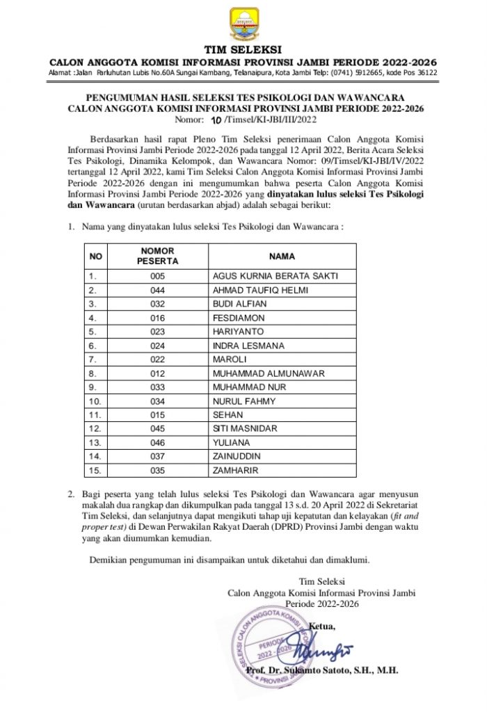 “Tim seleksi Anggota Komisi Informasi Provinsi Jambi Periode 2022-2026 dengan ini mengumumkan bahwa peserta Calon Anggota Komisi Informasi Provinsi Jambi Periode 2022-2026 yang dinyatakan lulus seleksi Tes Psikologi dan Wawancara (urutan berdasarkan abjad) adalah sebagai berikut: