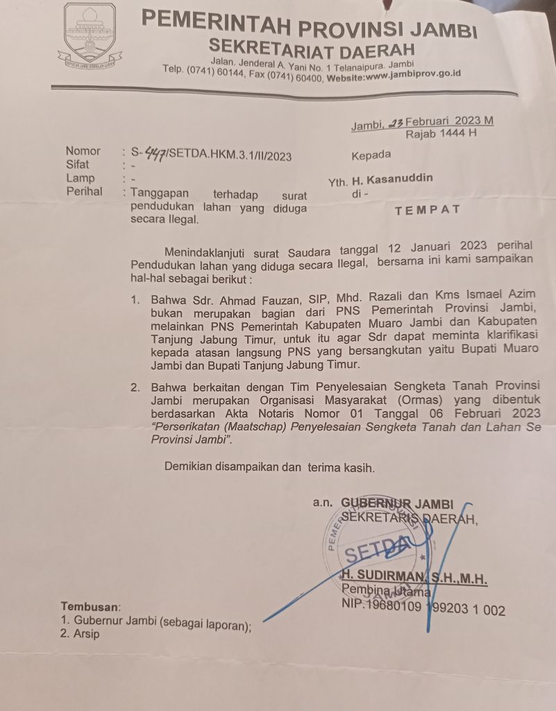 Seperti diberitakan sebelumnya, Kasanuddin telah mengirimkan surat ke Gubernur Jambi dan Kesbangpol Provinsi untuk mengklarifikasi legalitas Tim Penanganan Sengketa Tanah Provinsi Jambi, beranggotakan oknum PNS. Surat tersebut dilayangkan pada Jumat 13 Januari 2023 lalu.