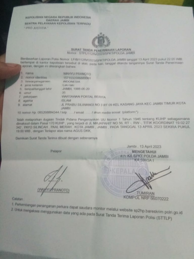 STPL Wartawan Korban pengeroyokan mafia BBM di Polda Jambi/ ist