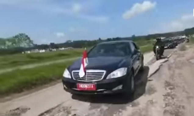 Dalam video yang dikirimkan Biro Kepresidenan, terlihat mobil yang dinaiki Presiden Jokowi melintasi jalan terusan Ryacudu Lampung yang kondisinya berlubang dan banyak genangan, rombongan kepresidenan terlihat cukup kesulitan melintasi jalur tersebut.