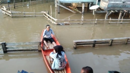Terlihat dampak banjir yang semakin meluas, banyak rumah warga yang digenangi air namun Erwan mengaku bila memenuhi kebutuhannya sehari hari, istrinya harus keluar rumah menggunakan perahu.