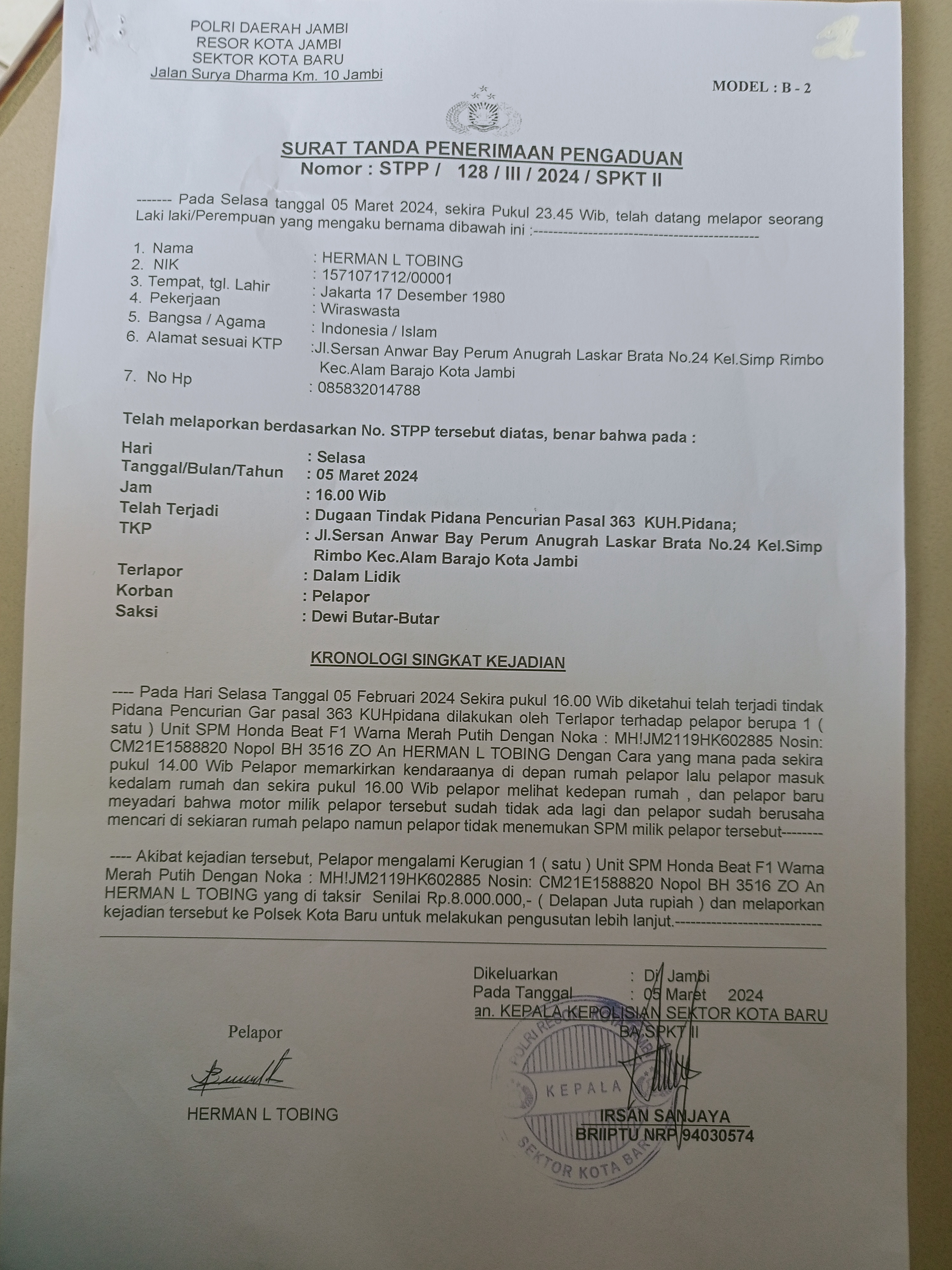 Atas kejadian tersebut, Herman langsung melaporkan ke pihak kepolisian Polsek Kota Baru dengan nomor laporan pengaduan STTP/128/III/2024/SPKT II.