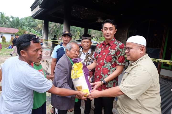 Pj Bupati Bachyuni Deliansyah menyerahkan bantuan berupa sembako, selimut, terpal, matrial bangunan untuk pembangunan rumah kembali kepada korban kebakaran.