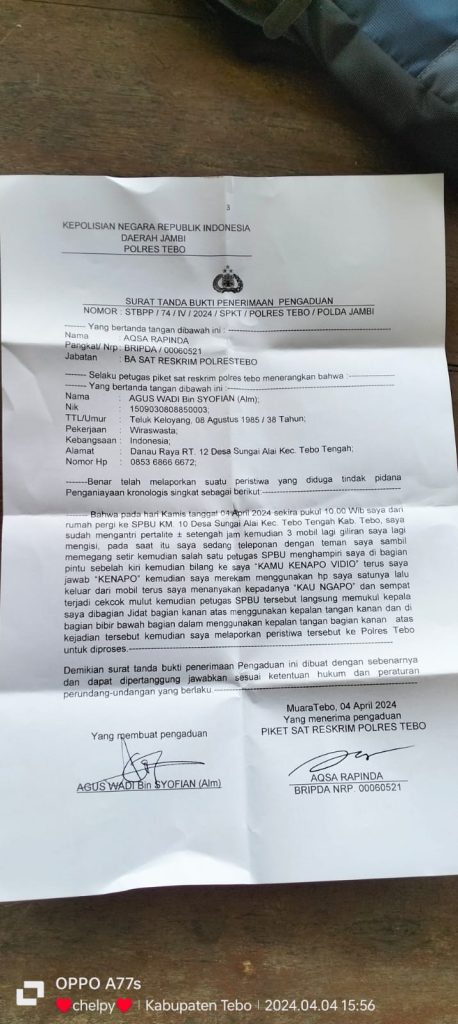 Atas kejadian kekerasan yang dialaminya Agus membuat laporan pengaduan ke Polres Tebo dengan nomor STBPP Nomor 74/IV/2024/SPKT/POLRES TEBO/POLDA JAMBI. (***)