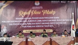 HALOINDONESIANEWS.COM, Batanghari- Selasa pagi KPU kabupaten Batanghari melaksanakan Rapat Pleno Rekapitulasi Penghitungan Perolehan Suara, Pemilihan Gubernur dan Wakil Gubernur Jambi, Bupati dan Wakil Bupati Batanghari, dan Penetapan Hasil Pemilihan Bupati dan Wakil Bupati Batanghari pada Pemilihan Serentak 2024, yang diselenggarakan di Gedung Pemuda Batanghari.