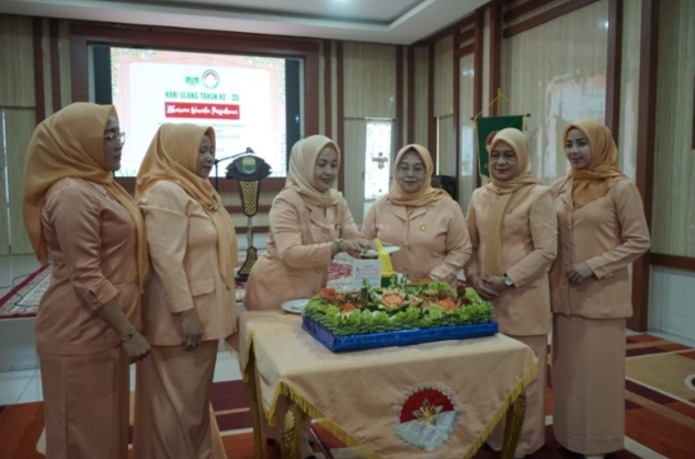 Haloindonesianews.com,MUAROJAMBI- Ketua TP PKK Kabupaten Muaro Jambi sekaligus ketua Dekranasda dan Dewan Penasehat Dharma Wanita Persatuan Kabupaten Muaro Jambi Habibah Najmi S.E menghadiri acara peringatan hari jadi Dharma Wanita Persatuan ( DWP ) pegawai Negri sipil yang ke 25, Senin (09/12/2024 ).