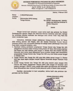 HALOINDONESIANEWS.COM, JAMBI – Gubernur Jambi sekaligus Ketua Umum Asosiasi Pemerintah Provinsi Seluruh Indonesia (APPSI) Dr. H. Al Haris, S.Sos., MH., memperjuangkan tenaga honorer seluruh Indonesia menjadi Pegawai Pemerintah dengan Perjanjian Kerja (PPPK). Hal tersebut tertulis dalam Surat Rekomendasi Ketua Umum APPSI nomor: A.005/APPSI/II/2025 yaitu Rekomendasi APPSI tentang tenaga Honorer pada tanggal 03 Februari 2025.