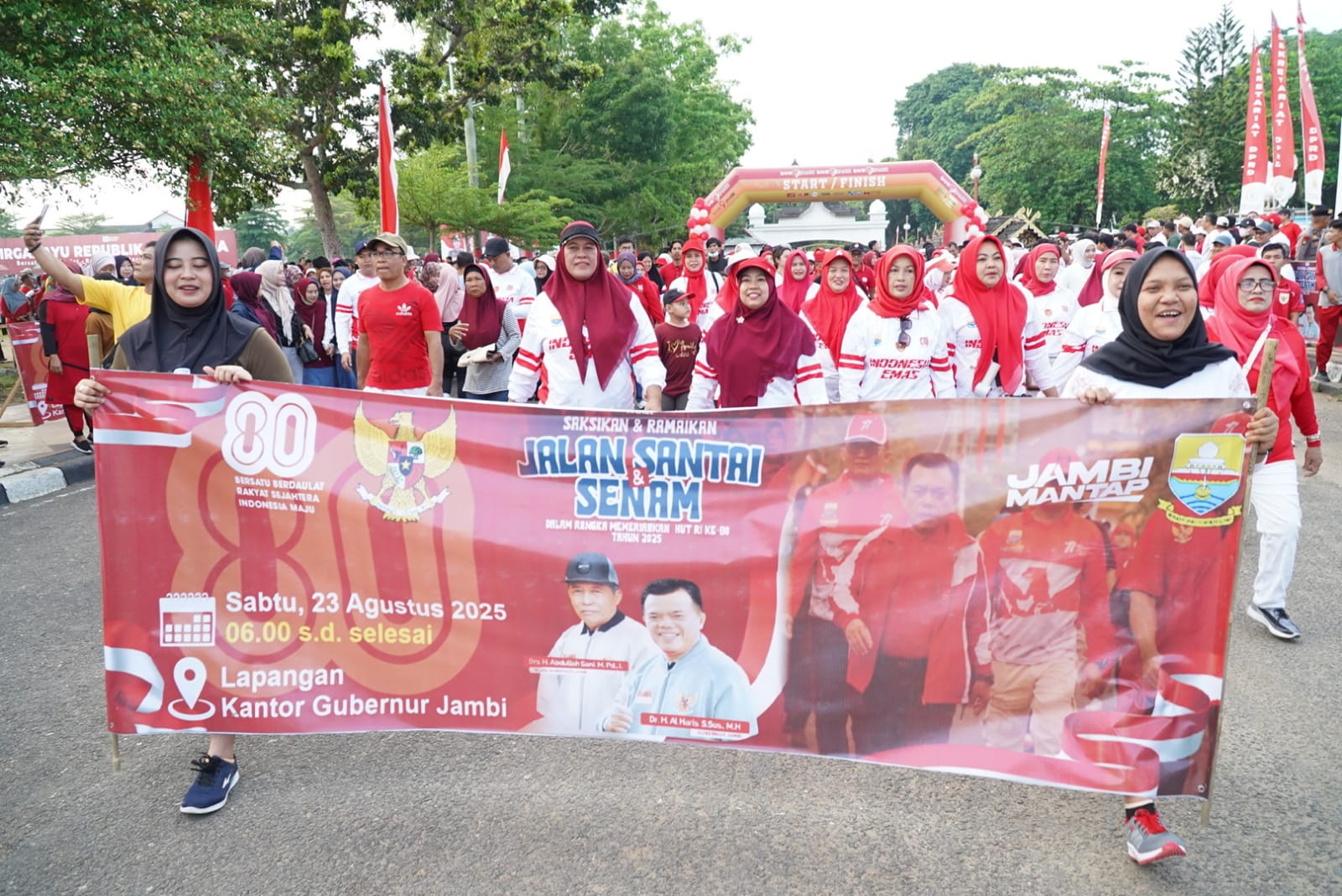 HALOINDONESIANEWS.COM, JAMBI- Gubernur Jambi Dr. H. Al Haris, S. Sos, MH melepas jalan santai yang merupakan rangkaian terakhir kegiatan dalam rangka peringatan HUT RI ke- 80 tahun 2025, bertempat di Depan Gedung DPRD Provinsi Jambi, Sabtu (23/08/2025) pagi.
