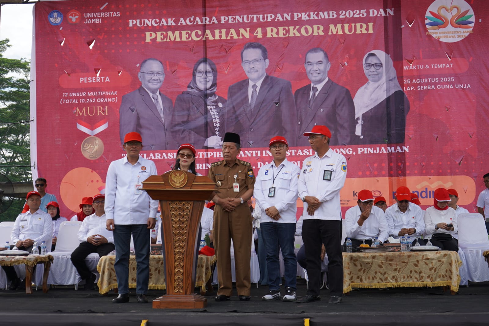 “Saya sangat mengapresiasi yang setinggi-tingginya atas capaian luar biasa dalam acara penutupan PKKMB tahun ini. Saya bangga mendengar bahwa kampus ini berhasil mencatatkan beberapa rekor MURI, sebuah pencapaian yang bukan hanya membanggakan bagi Universitas Jambi, tetapi juga mengharumkan nama Provinsi Jambi. Rekor ini membuktikan bahwa Civitas Akademika Universitas Jambi mampu berkarya dengan kreativitas, inovasi, dan semangat kebersamaan,” imbuhnya.