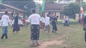 HALOINDONESIANEWS.COM, Ma Tembesi- Keseruan HUT Ke-80 Kemerdekaan Republik Indonesia di Kelurahan Kampung Baru Kecamatan Muara Tembesi Kabupaten Batanghari, Terlihat dengan adanya Lomba Sepak Bola sarung yang diikuti oleh semua Ketua RT dalam Lingkup Kelurahan Kampung Baru, group Regu Sepak Bola Sarung dibagi dua Kelompok Regu, diantaranya Setiap Ketua RT Harus tampil di Lapangan Hijau memperebutkan bola untuk memperoleh poin dengan menendang ke Gawang Lawan, Antara Ketua RT Lingkungan 1 dan Ketua RT dalam lingkungan 2 , Keseruan terlihat disaat para Ketua RT yang kerap terjatuh disaat Menendang Bola dengan Menggunakan Kain Sarung. Minggu (31/08/2025)