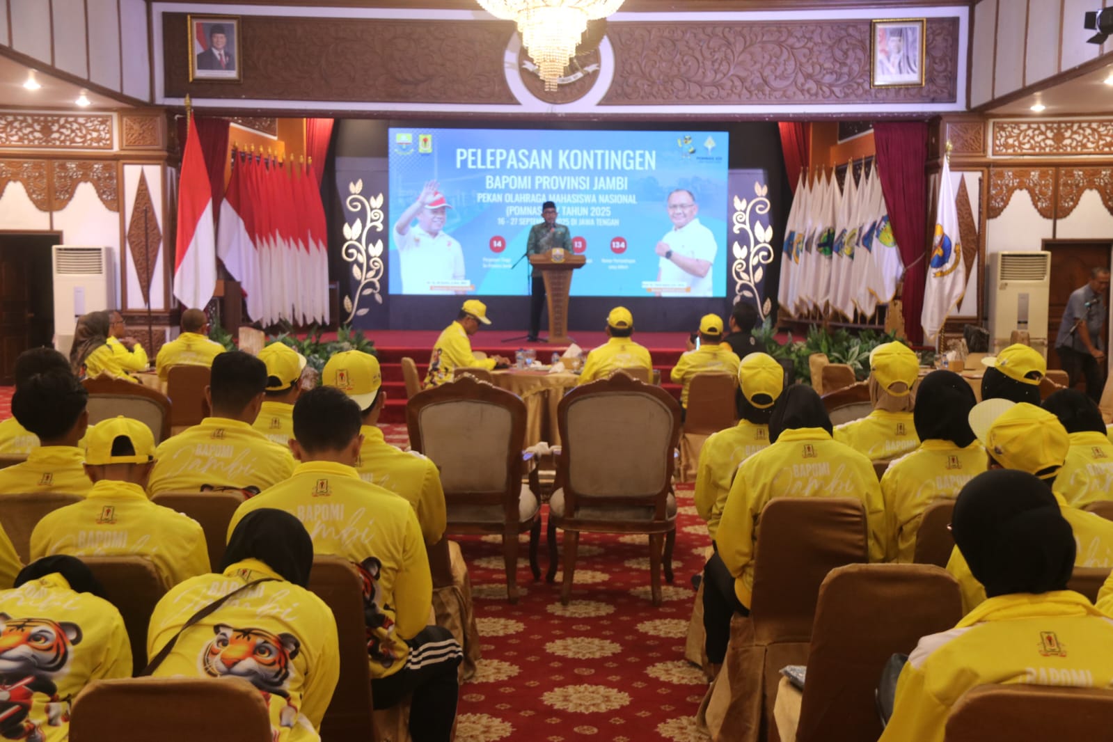 HALOINDONESIANEWS.COM, Jambi– Sekretaris Daerah Provinsi Jambi, Dr. H. Sudirman, SH., MH., secara resmi melepas Kontingen Badan Pembina Olahraga Mahasiswa Indonesia (BAPOMI) Provinsi Jambi yang akan berlaga pada Pekan Olahraga Mahasiswa Nasional (POMNAS) XIX Tahun 2025. Ajang bergengsi tingkat nasional tersebut akan digelar di Jawa Tengah pada 16 hingga 27 September 2025, dengan menghadirkan ribuan mahasiswa atlet dari seluruh Indonesia. Prosesi pelepasan kontingen dilaksanakan di Auditorium Rumah Dinas Gubernur Jambi, Jum’at (12/09/2025) malam.
