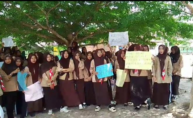 Sambil membawa spanduk, para siswa menyuarakan tuntutan dan aspirasinya kepada kepala sekolah, Novita Diana.
