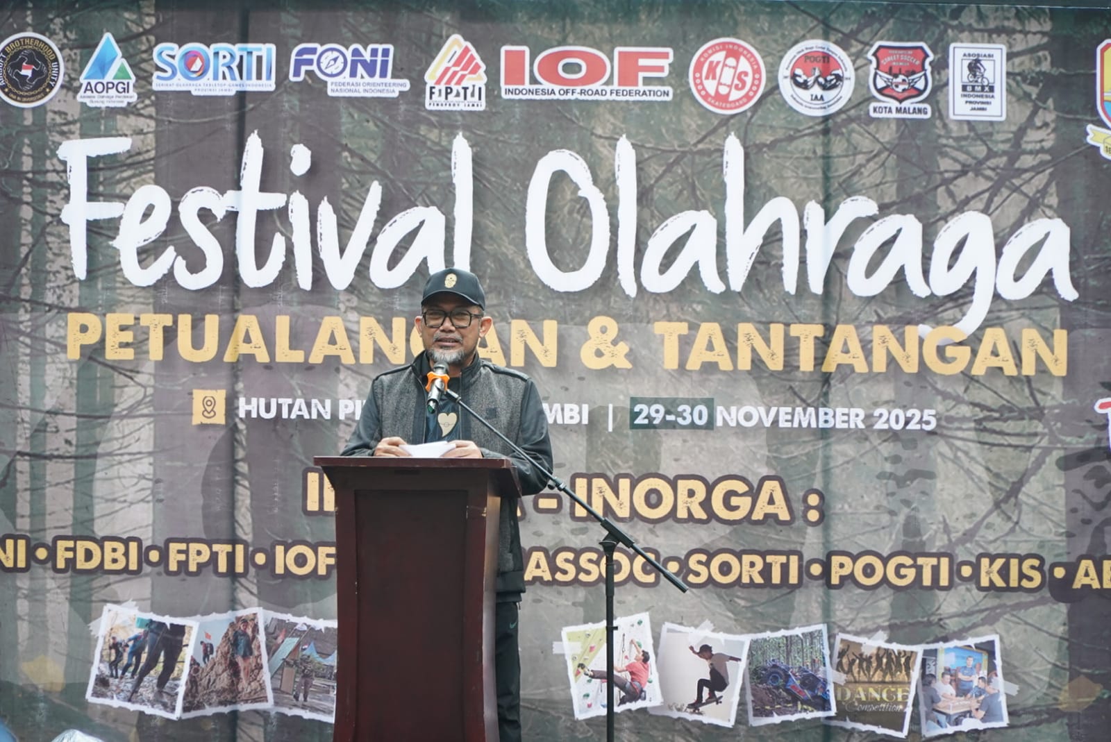 HALOINDONESIANEWS.COM, JAMBI- Sekretaris Daerah Provinsi Jambi Dr. H. Sudirman, SH,MH membuka secara langsung Festival Olahraga Petualangan Dan Tantangan KORMI Tahun 2025 yang diselenggarakan di Hutan Pinus Pal 10, Kota Jambi, Sabtu (29/11/2025) pagi. Hadir pada kesempatan tersebut Ketua Umum KORMI Provinsi Jambi Dr. Edi Purwanto, S.Hi., M.Si yang juga merupakan anggota DPR RI Dapil Provinsi Jambi, unsur Forkopimda Provinsi Jambi, Ketua Umum beserta pengurus Olahraga Petulangan dan Tantangan di bawah naungan KORMI, para peserta dan undangan lainnya.
